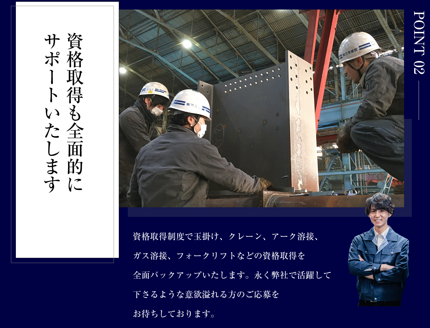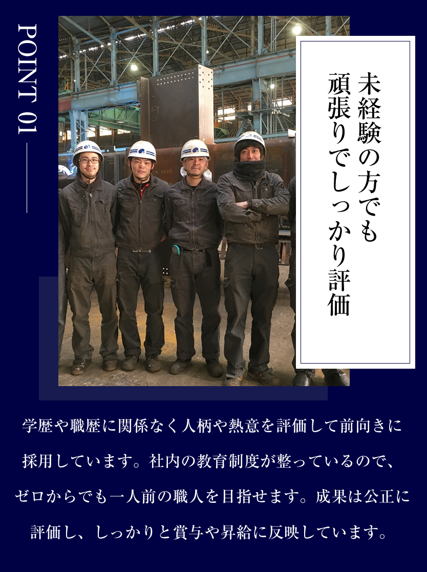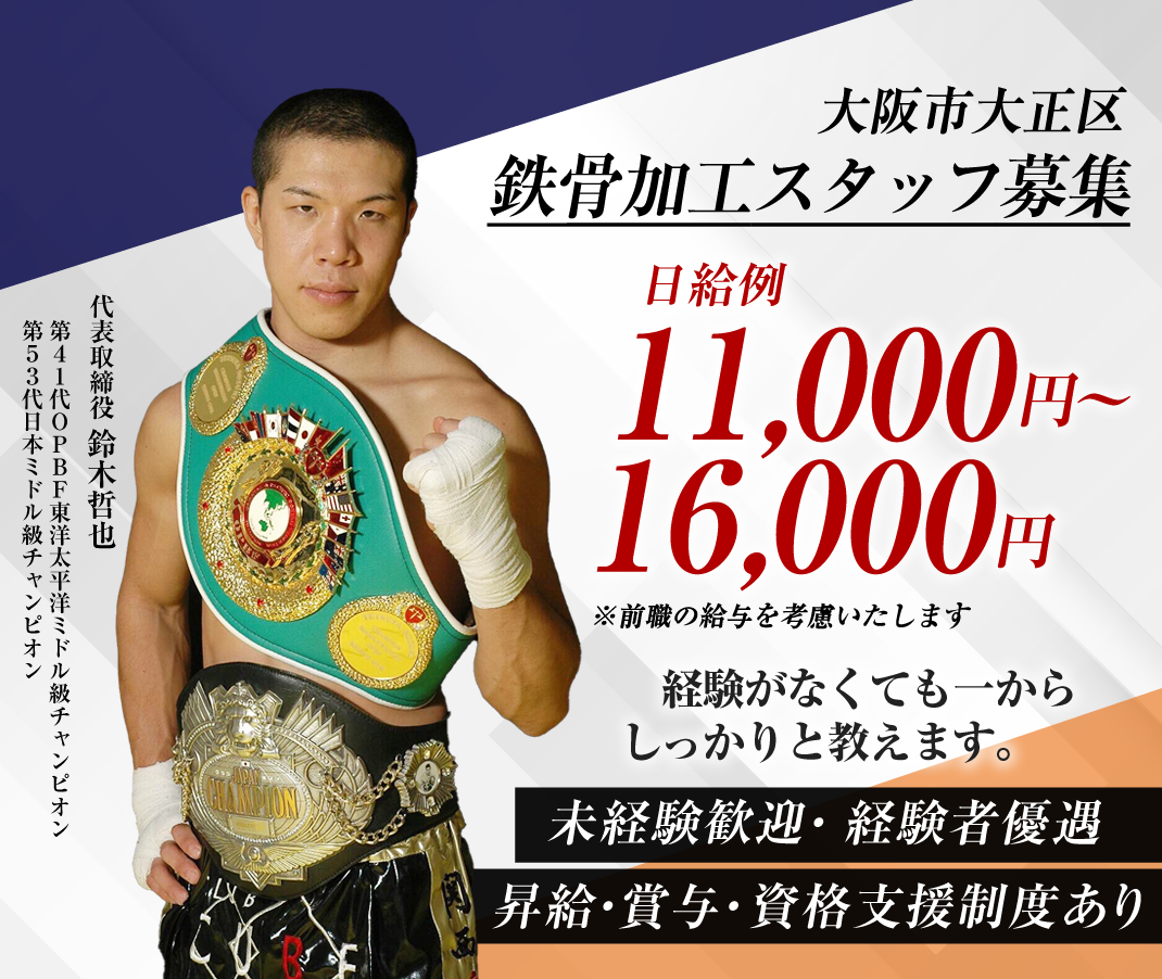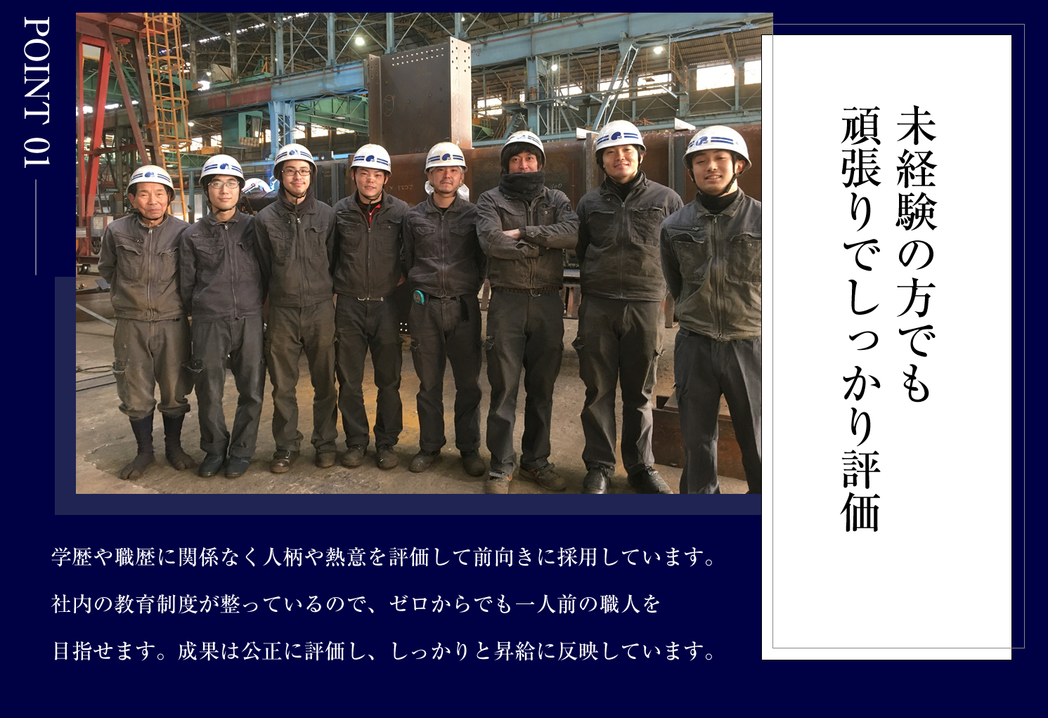 当社は駅やビル、商業施設、病院、大学などの鉄骨製品を製作する会社です。 学歴や経歴に関係なく頑張る人には安定した生活や収入を得てもらえるよう 各種手当や資格取得支援、交通費支給など収入の面でもしっかりサポート致します。 未経験の方でも安心、安全に作業や技術を習得してもらえるようにOJT制度を取り入れています。 その他にも社会保険完備、高い有給休暇取得率など、若い皆様が安心して働ける環境整備を心掛けております。 ぜひあなたの夢とやる気とパワーを当社で発揮してください! 。