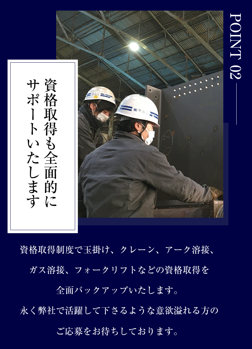 | 待遇 | ○各種保険完備 ○マイカー通勤可 ○有給休暇使用率高 ○各種資格取得支援あり(玉掛け、クレーン、アーク溶接、ガス溶接、フォークリフトなど) 〇交通費支給(¥10000/月まで) 〇家族手当あり(10000~) 〇その他手当あり 〇制服、革手、消耗品など支給 |
